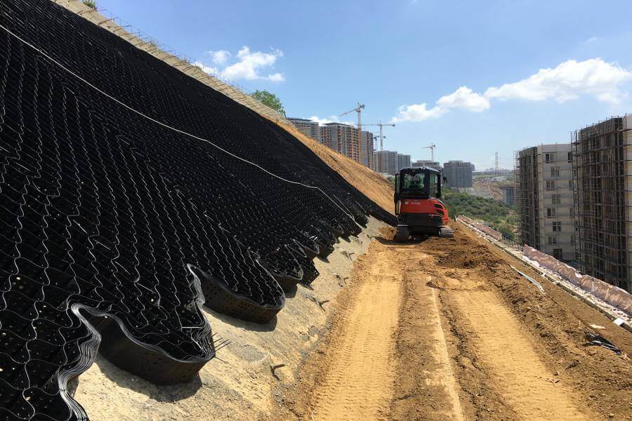 Hücresel Dolgu Sistemi (Geocell) yüksek yoğunluklu polietilen’den (HDPE) üretilir, kullanım yerine göre farklı yükseklikleri mevcuttur, malzemeler şeritler halindeyken ultrasonik kaynakla birleştirilir ve açıldığında bal peteğine benzer bir hal alır. Hücrelerin içi kullanım yerine göre farklı malzemelerle (kum, çakıl, toprak, öğütülmüş taş, beton vs.) doldurulur. Geocell Hücresel dolgu sistemlerinin başlıca kullanım yerleri yüzeysel erozyondan etkilenen eğimli yüzeylerin stabilizasyonu, temel güçlendirme, dere yatakları stabilizasyonu, çok eğimli yeşil çatılar ve istinad duvarları olarak sayılabilir.